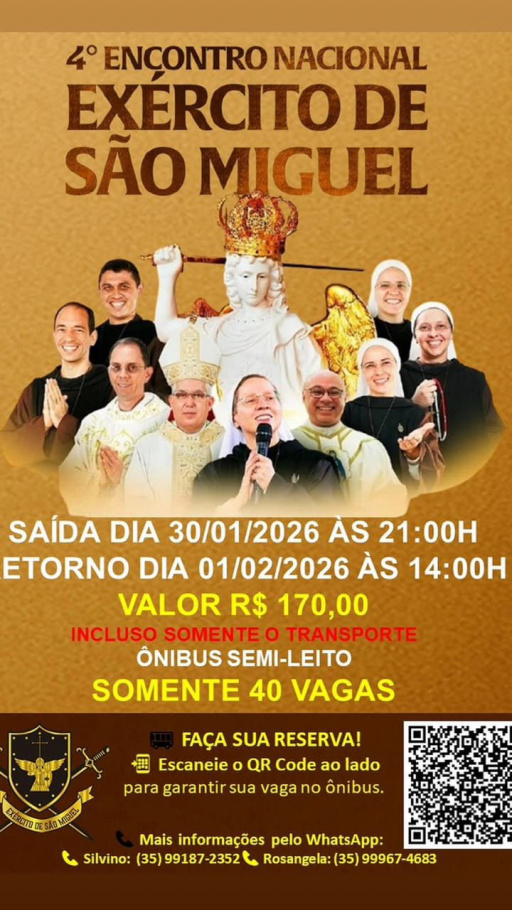 De 29 de janeiro a 1º de fevereiro, a sede da Canção Nova, em Cachoeira Paulista (SP), será o ponto de encontro de milhares de fiéis de todo o Brasil para o 4º Encontro Nacional do Exército de São Miguel. O evento reunirá homens e mulheres dispostos a viver dias intensos de oração, formação e combate espiritual, clamando pelos milagres e pela ação de Deus em suas vidas.