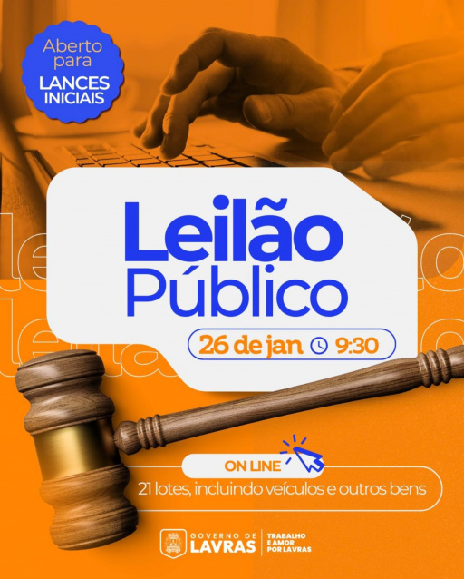 A Prefeitura de Lavras divulgou a realização de um leilão público online de bens considerados inservíveis para a Administração Municipal. De acordo com as informações oficiais, o leilão ocorrerá no dia 26 de janeiro de 2026, a partir das 9h30, exclusivamente pela internet.