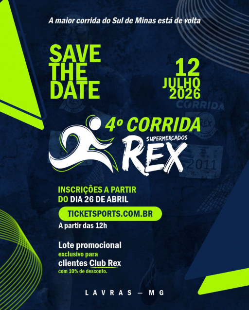 A tradicional Corrida Supermercados Rex está de volta a Lavras e promete movimentar atletas e amantes da prática esportiva em toda a região. As inscrições para a 4ª edição do evento serão abertas neste domingo, dia 26 de abril, a partir das 12h, pelo site Ticket Sports.