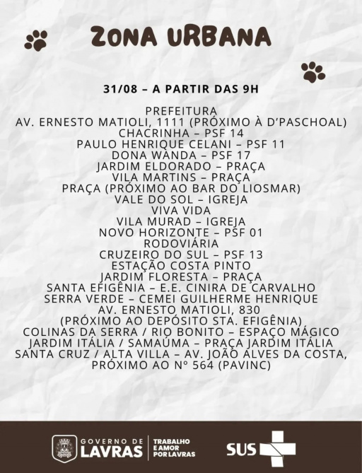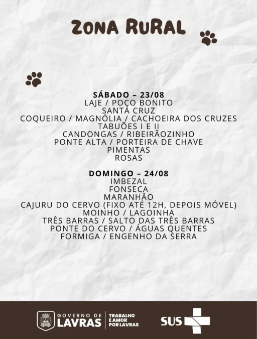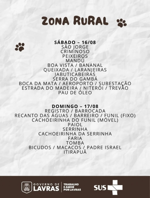 Serão três finais de semana dedicados exclusivamente à saúde dos pets, com dezenas de pontos espalhados por Lavras. Os dois primeiros finais de semana (dias 16, 17, 23 e 24) serão destinados à zona rural. Já nos dias 30 e 31 de agosto, a vacinação acontece em diversos bairros da zona urbana.