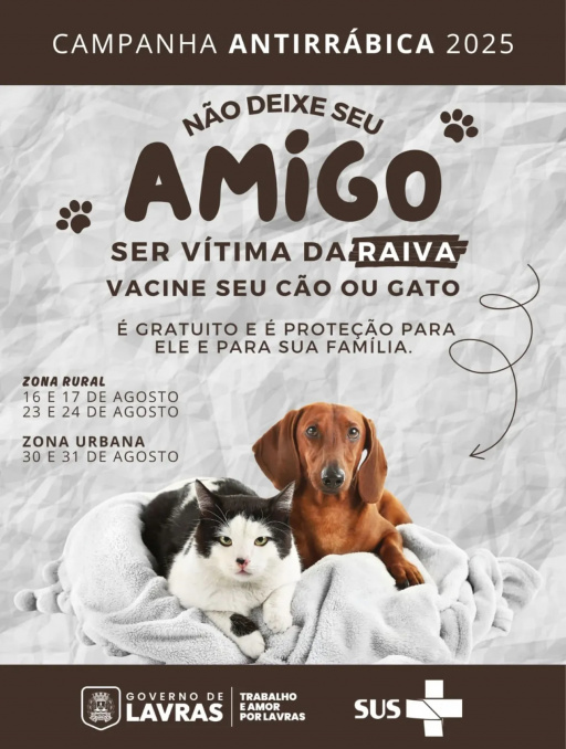 A Prefeitura de Lavras, por meio da Secretaria Municipal de Saúde, inicia neste mês a Campanha de Vacinação Antirrábica 2025. A ação gratuita tem como objetivo garantir a proteção da população contra a raiva, uma doença grave que afeta animais e seres humanos. A vacinação é destinada a cães e gatos e será realizada entre os dias 16 e 31 de agosto, contemplando tanto a zona rural quanto a zona urbana do município.