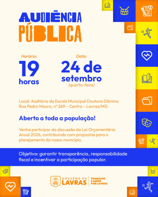 A Prefeitura de Lavras convida a população para participar da audiência pública que vai discutir a Lei Orçamentária Anual (LOA) de 2026. O encontro será realizado no dia 24 de setembro, às 19h, no Auditório da Escola Municipal Doutora Dâmina, localizado na Rua Pedro Moura, nº 269, Centro.