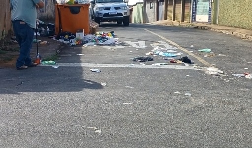 Morador com uma vassoura tenta ajuntar o lixo para melhorar o aspecto da rua