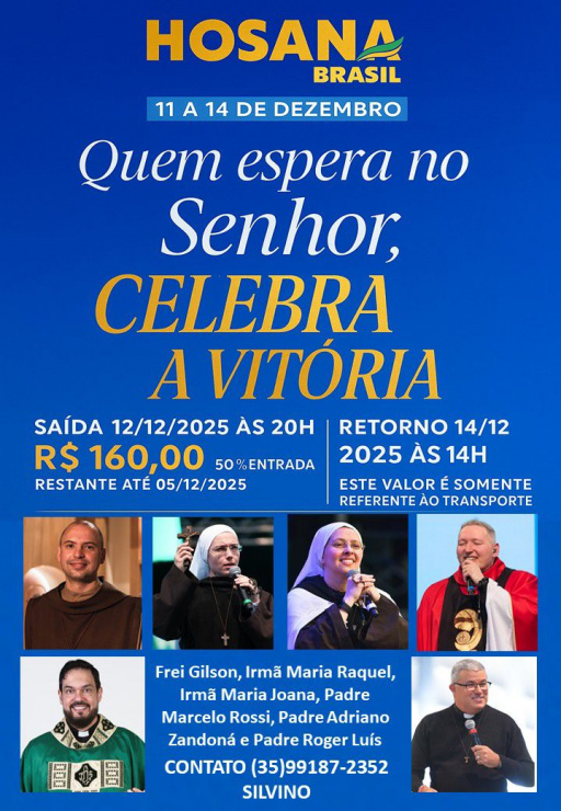 A Caravanas Lavras x Canção Nova têm a alegria de convidar você e sua família para o Hosana Brasil, que acontecerá de 11 a 14 de dezembro de 2025, na sede da Canção Nova, em Cachoeira Paulista/SP.