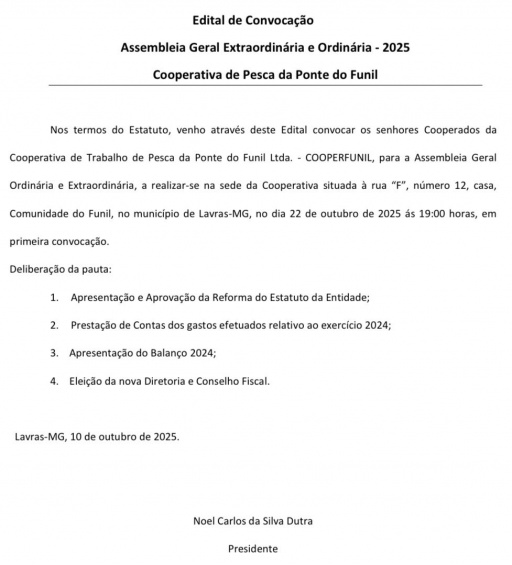 Jornal de Lavras - Publicação Oficial 01, de 10/10/25 - Cooperativa de Pesca da Ponte do Funil - Cooperfunil