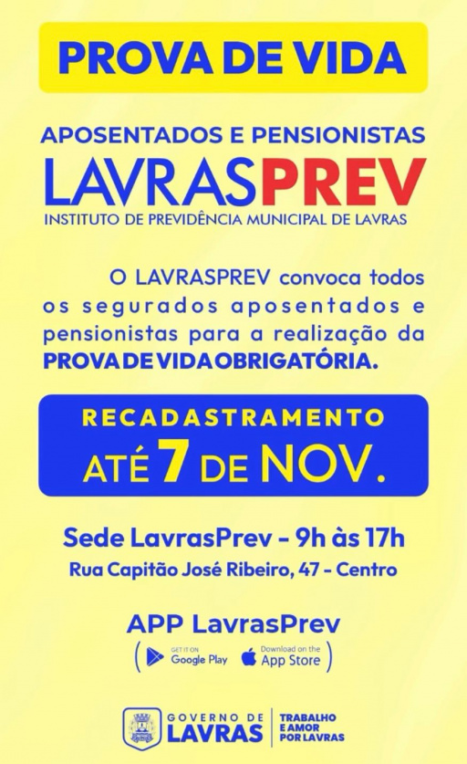 O Instituto de Previdência Municipal de Lavras (LavrasPrev) está convocando todos os seus aposentados e pensionistas do município para a realização da prova de vida obrigatória, procedimento que tem o objetivo de manter atualizados os dados dos beneficiários e garantir a continuidade do pagamento dos proventos.