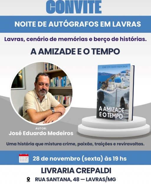 O escritor José Eduardo Medeiros, lavrense radicado em Montes Claros, retorna à sua terra natal para o lançamento oficial do seu romance de estreia, "Amizade e o Tempo". O evento, um dos mais aguardados da agenda cultural local, será realizado na Livraria Crepaldi, na rua Sant'Anna, no dia 28 de novembro, às 19h.