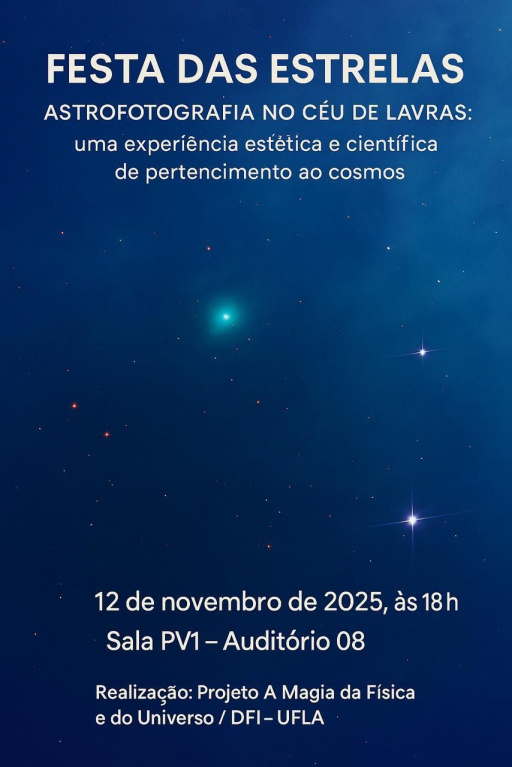 Será promovida na Universidade Federal de Lavras (Ufla), nesta quarta-feira, 12 de novembro, às 18h, a "Festa das Estrelas", um encontro entre arte, ciência e sensibilidade. O evento será realizado na Sala PV1 – Auditório 08, no Centro de Convenções da universidade, e é aberto ao público de todas as idades.