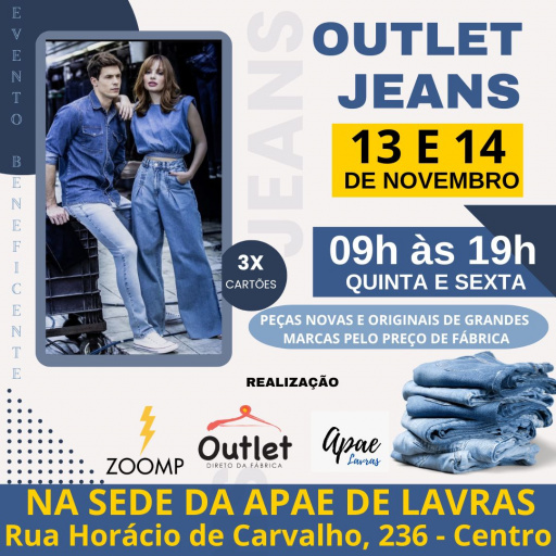 Nesta quinta e sexta-feira, dias 13 e 14 de novembro, a sede da Apae de Lavras receberá mais uma edição do tradicional Outlet Jeans beneficente, evento já conhecido na cidade por unir solidariedade e boas oportunidades de compra.