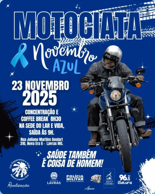 A cidade de Lavras vai ganhar as ruas no próximo domingo, 23 de novembro, com a Motociata Novembro Azul 2025, uma ação que une conscientização, solidariedade e paixão por motocicletas. O evento convida motociclistas de Lavras e região - e toda a comunidade - a acelerar juntos em apoio à prevenção do câncer de próstata, reforçando a importância do diagnóstico precoce para salvar vidas.