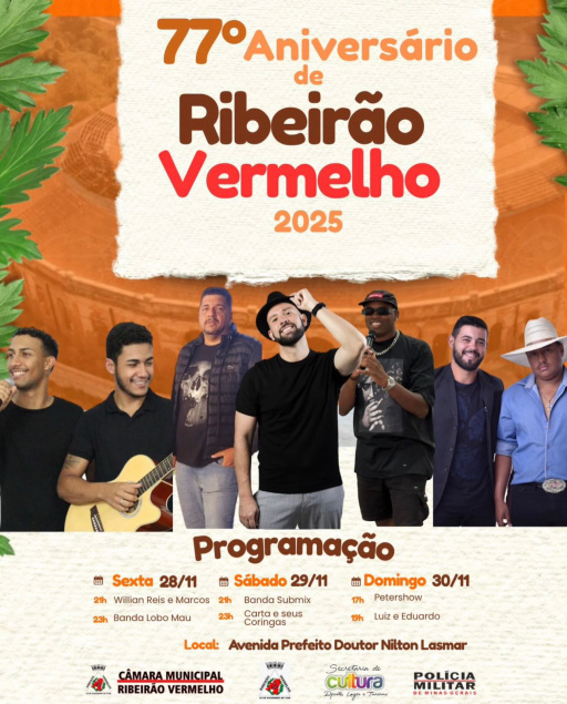 Segundo a organização, o aniversário de Ribeirão Vermelho é um momento simbólico para reforçar o sentimento de pertencimento e valorizar a identidade local. A realização é da Câmara Municipal, com apoio da Secretaria de Cultura, Esporte, Lazer e Turismo e da Polícia Militar de Minas Gerais, que atuarão para garantir estrutura e segurança ao público.