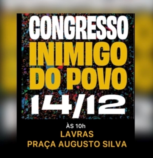 Um ato público está sendo organizado em Lavras para este domingo, dia 14, na praça Augusto Silva, às 10h. A manifestação, denominada "Congresso Inimigo do Povo" pelos organizadores, ocorre em decorrência da recente aprovação do Projeto de Lei (PL) da Dosimetria e da Proposta de Emenda à Constituição (PEC) do Marco Temporal pelo Congresso Nacional.