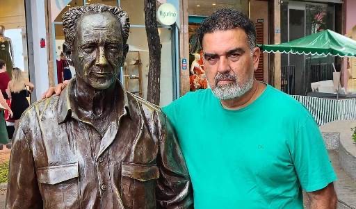 O jornalista, advogado, professor e escritor Aureliano Borges, ao lado da estátua de Roberto Drummond, na praça da Savassi, na Região Centro-Sul de Belo Horizonte