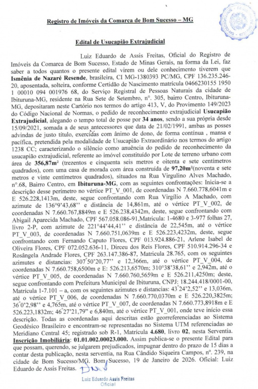 Jornal de Lavras - Publicação Oficial 01, de 26/01/26 - Edital de Usucapião Ismênia de Nazaré Resende