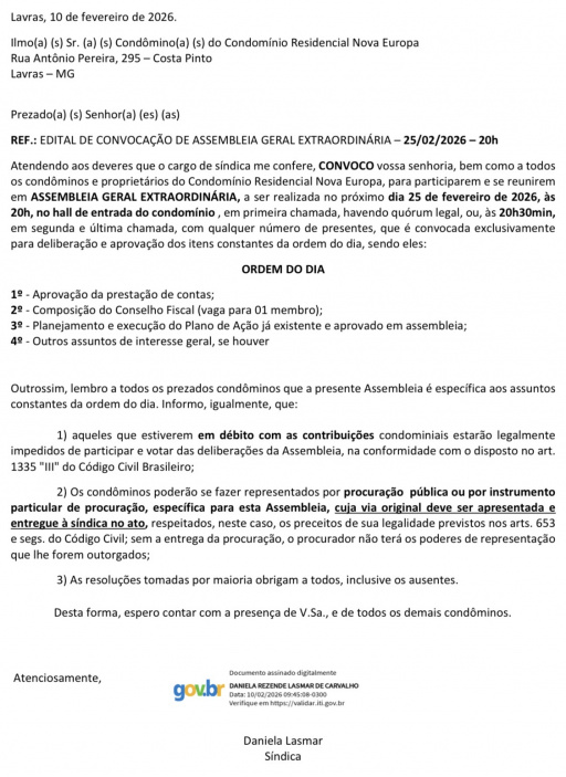 Jornal de Lavras - Publicação Oficial 02, de 10/02/26 - Condomínio Nova Europa