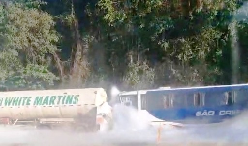 Na foto percebe-se a nuvem branca de oxigênio vazando do caminhão e invadindo a cabine do ônibus, onde estava o motorista