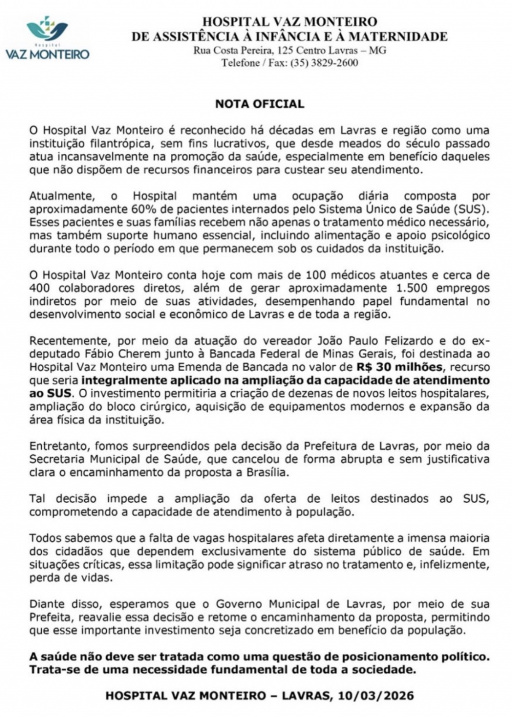 Na nota, o hospital afirma que o encaminhamento da proposta a Brasília foi cancelado de forma abrupta pela Prefeitura de Lavras, por meio da Secretaria Municipal de Saúde.