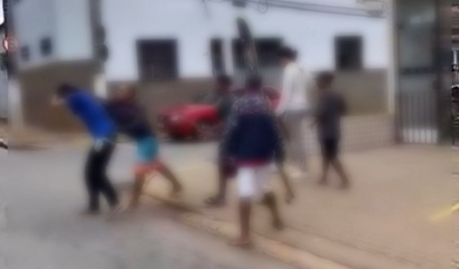 Nas imagens, homens batem com pedaços de madeira em um indivíduo em situação de rua apontado por moradores como suspeito de importunar sexualmente mulheres na cidade.