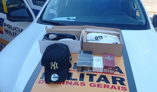Durante as buscas no interior do veículo foram localizados diversos materiais que seriam provenientes do roubo, dentre eles pares de tênis, frascos de perfumes e bonés.
