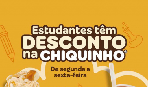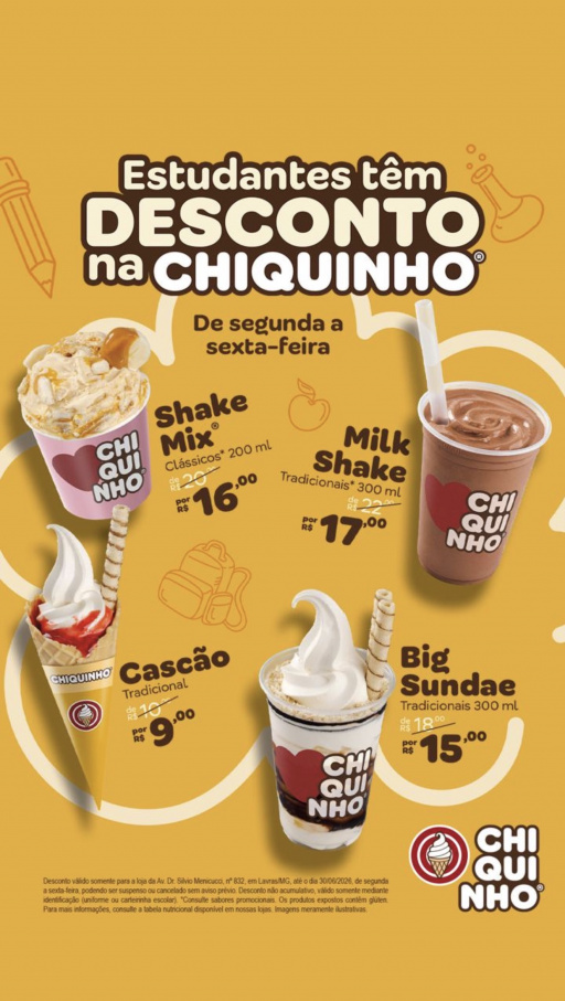 Uma boa notícia para os estudantes de Lavras: a Chiquinho Sorvetes está com uma campanha especial que garante descontos em alguns dos produtos mais queridos do cardápio, de segunda a sexta-feira, até 30/06/26, na unidade da Perimetral (av. Silvio Menicucci, 832, Lavras).