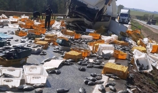 A carreta baú, carregada com a carga de peixes bateu na traseira de uma carreta carregada com cimento. Com o impacto, o baú se rompeu e a carga veio toda para frente, arrebentou a estrutura do baú e se espalhou pela pista.
