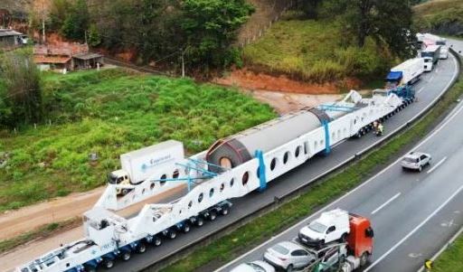 Para quem está na estrada, o comboio é um espetáculo à parte, ele mede 123 metros, tem um peso total de 850 toneladas e é transportado por uma estrutura de 44 eixos e 264 pneus.