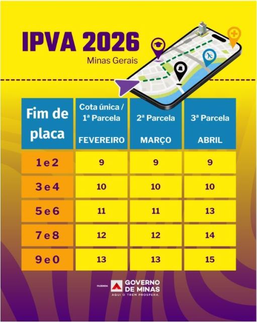 O Governo de Minas Gerais inicia, na próxima segunda-feira, dia 9 de fevereiro, a cobrança do Imposto sobre a Propriedade de Veículos Automotores (IPVA) de 2026. O cronograma de vencimentos da primeira parcela (ou cota única) segue o final da placa e se estende até o dia 13 de fevereiro.